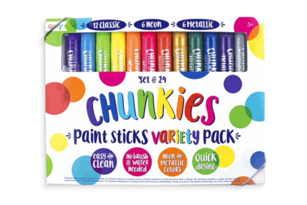 - Tempera paint: We love regular tempera paint for finger painting or using traditional paint brushes, but my kids are obsessed with these paint sticks. These Chunkies from Ooly make painting a little less messy for days when you just aren’t up for a full painting extravaganza. Which, if we are being honest, is most days..