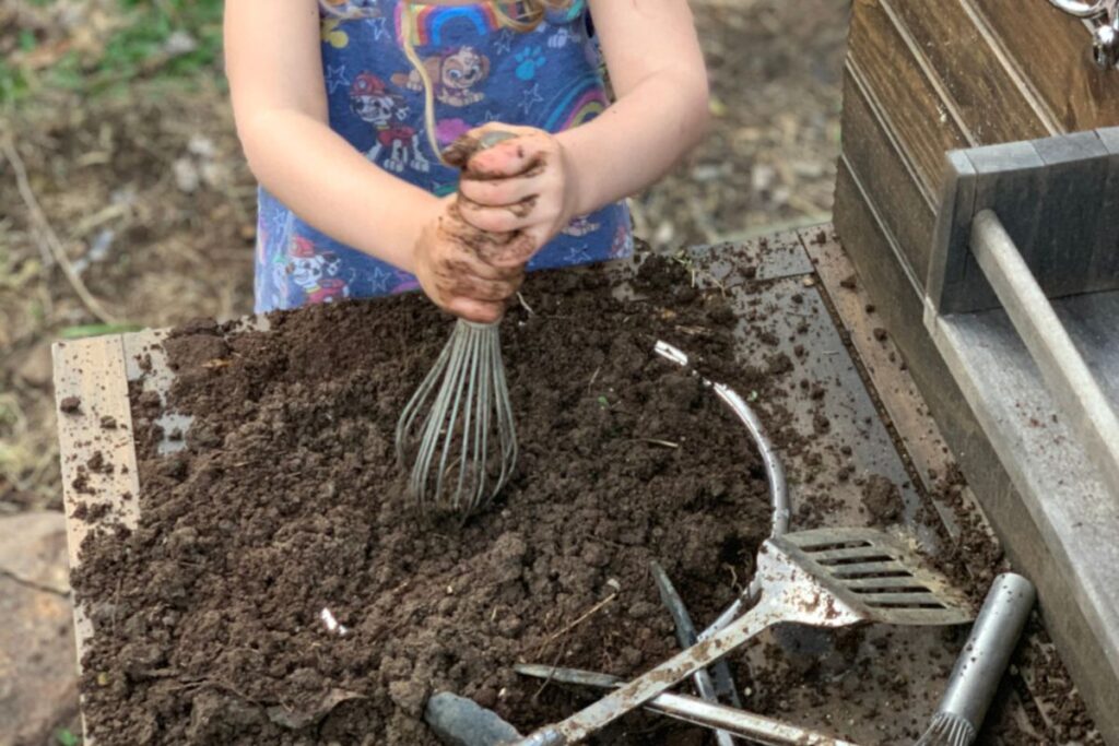 You can even give them other mud-friendly kitchen toys, like this Bubble Whisk. They can use this to “scramble” the mud or mix it with more water to make mud soup. Would your child enjoy pretending to be a chef?