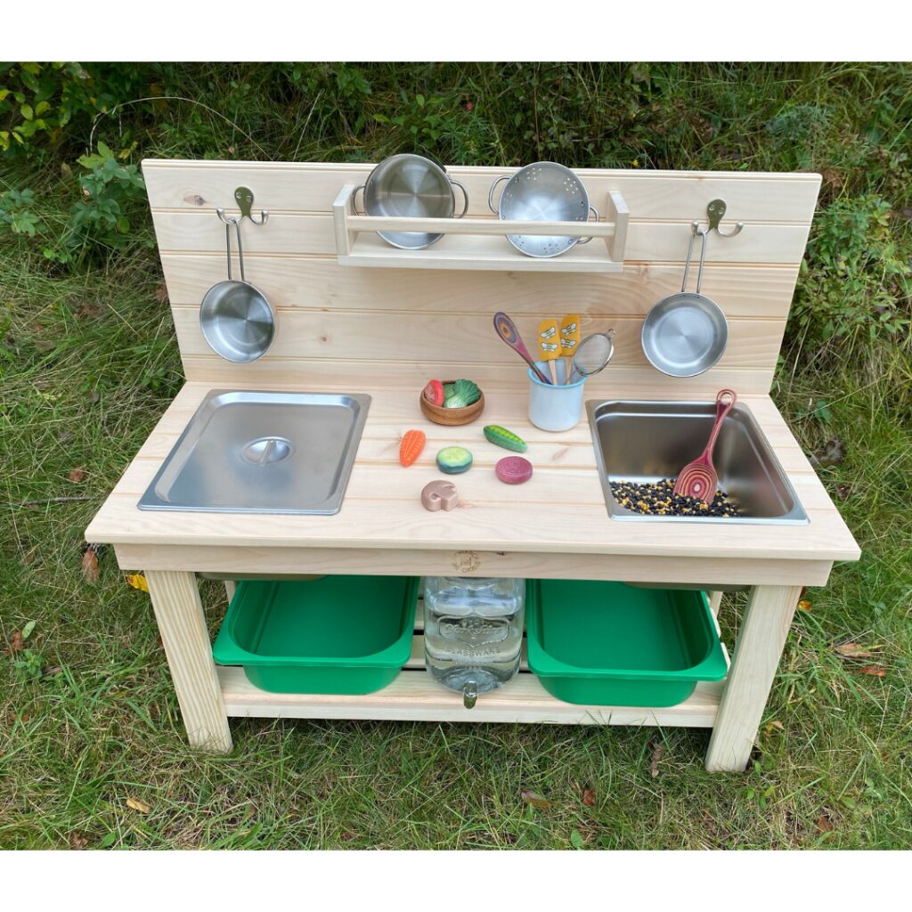 You can put anything you want into a mud kitchen! The more sensory toys you have, the more activities your imaginative little ones will create.