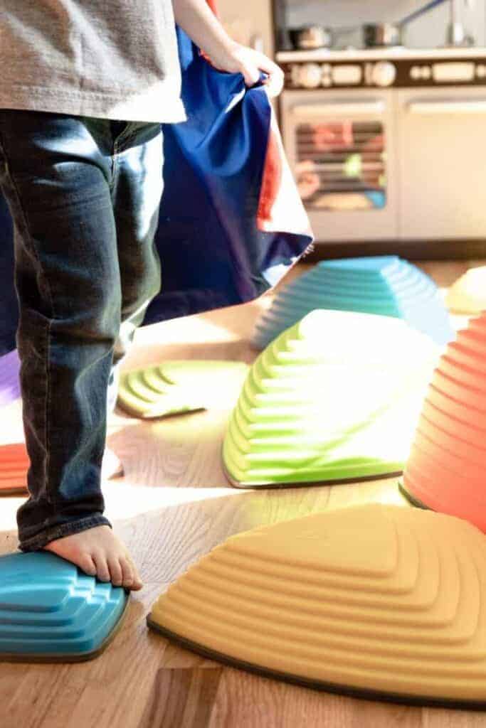 Having an open space, a gymnastics mat, or a play mat (we love our Ruggish play mat) is a great way to encourage gross motor play. We have multiple items for climbing, jumping, and balancing. Our favorites are the Nugget, a pikler triangle, a wobble board, the Gonge Hilltops and Riverstones.